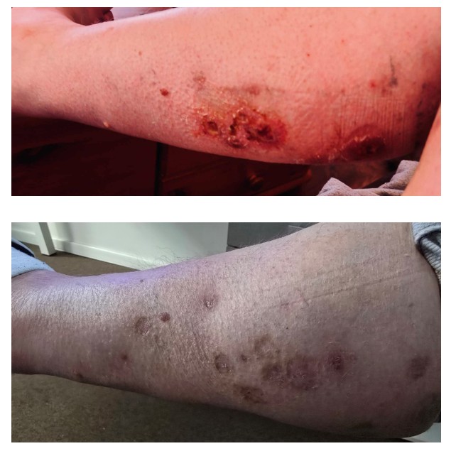 - Nález z ledna 2024, při léčbě mykofenolátem mofetilem. Na bérci jsou patrné rozsáhlé ložiskové kožní defekty s centrálními erozivně-ulcerovanými plochami krytými žlutohnědými krustami a hemoragickými příškvary. Okraje lézí jsou nepravidelné, s červenofialovým lemováním, v okolí je přítomen erytém a mírný edém.